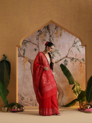 - Handwoven Pure Katan Silk Red Banarasi Mughal Boota Saree