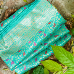 - Handwoven Turquoise Blue Pure Kora Mashru Silk Banarasi Saree