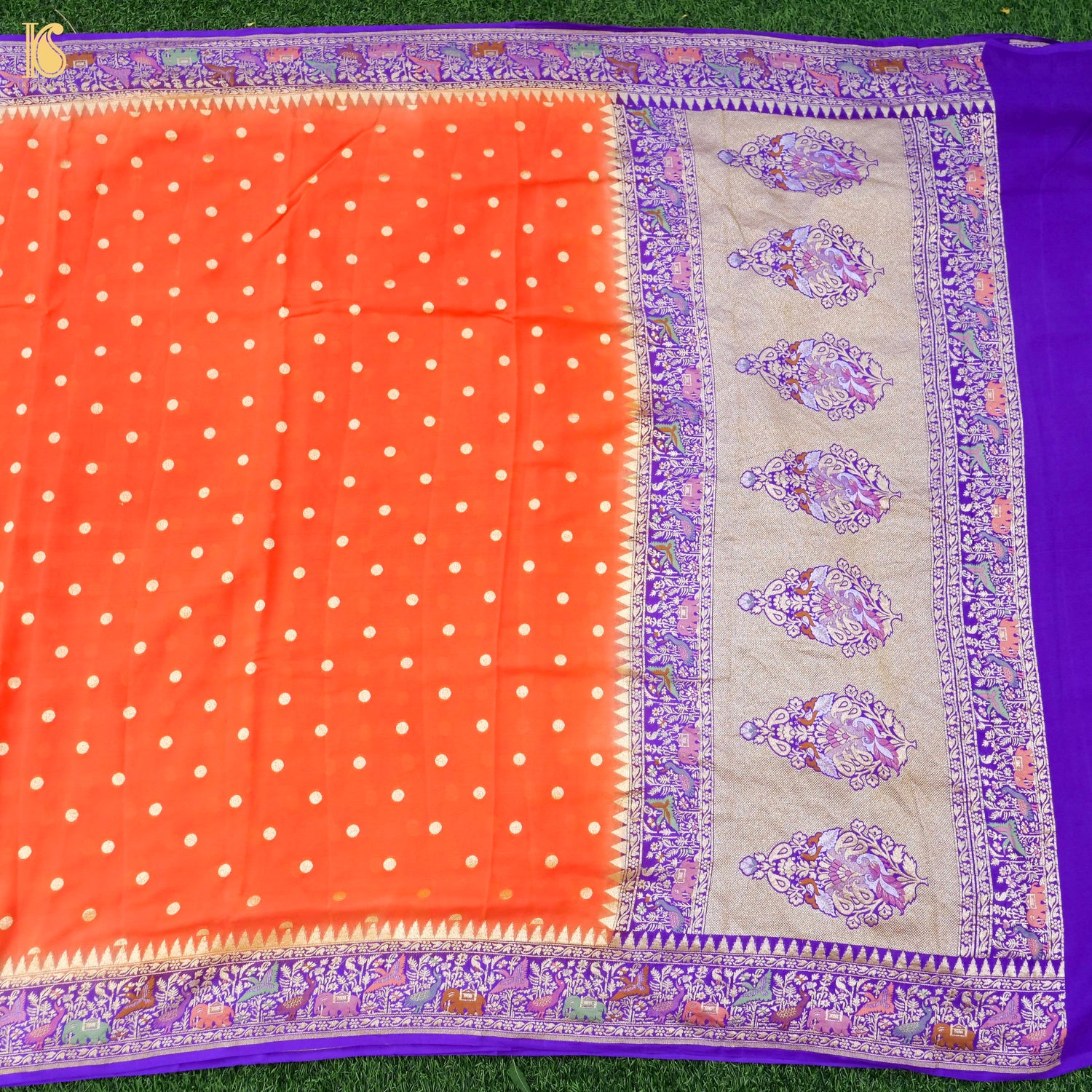 Elevate your style with our Pure Georgette Silk Meenakari Banarasi Saree. This luxurious Banarasi saree showcases an intricate Meenakari peacock, adding timeless charm and regality to your ensemble. Celebrate Banaras' artistry and heritage. Can be dyed in any color of your choice.
