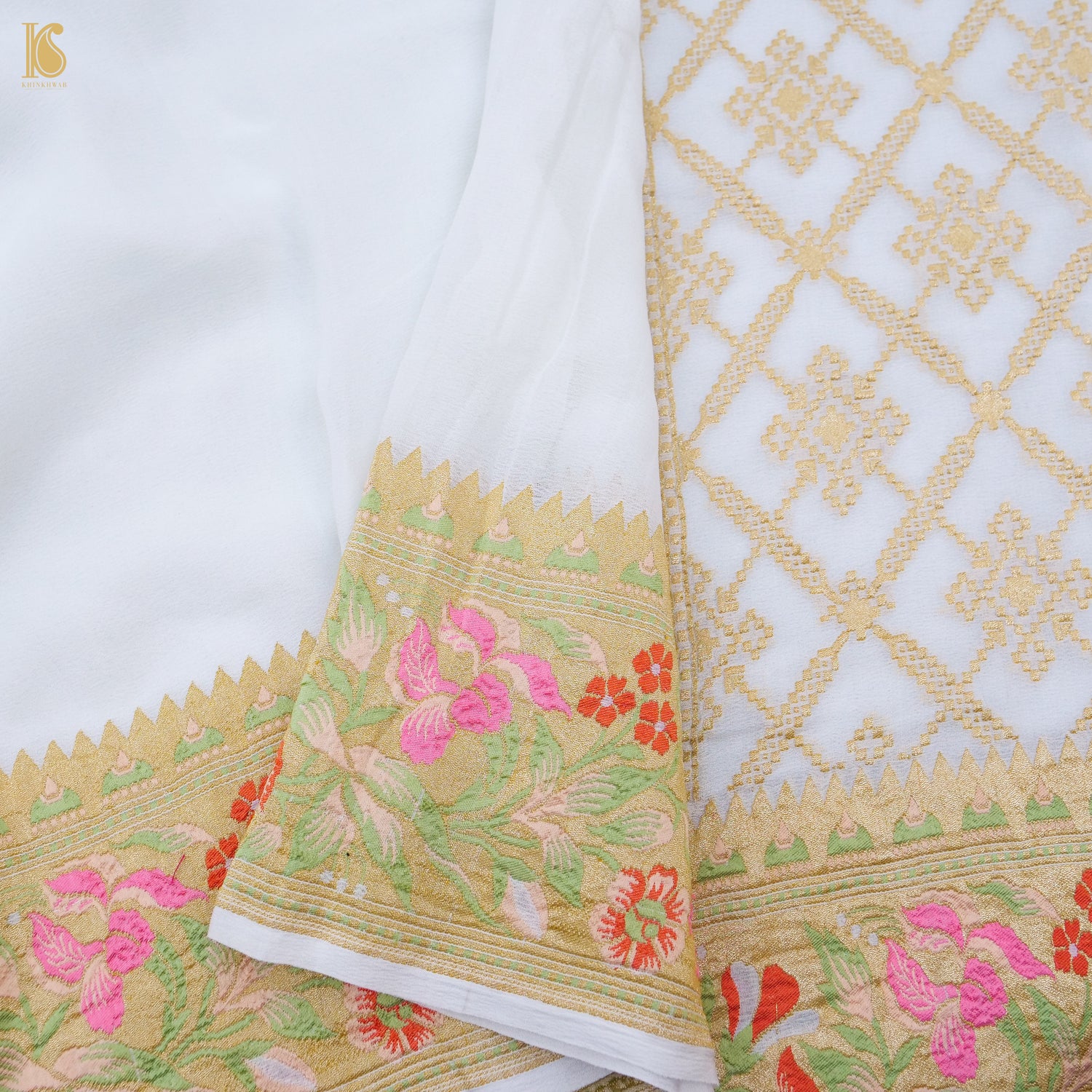 White Pure Georgette Handloom Banarasi Rose Border Saree