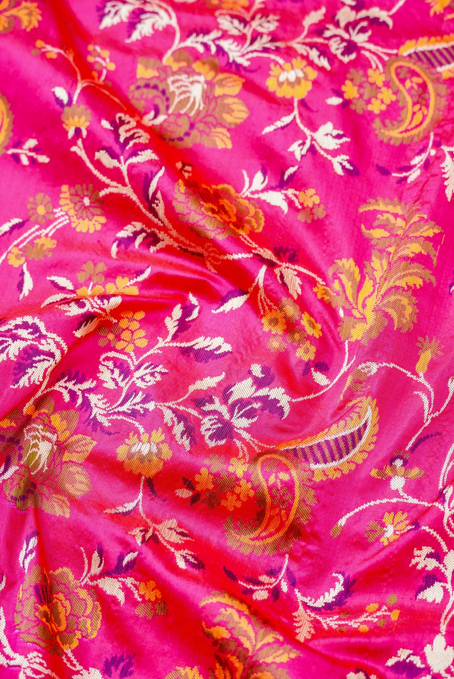 Weave - Kinkhab weave - In Banaras, brocade is also known as kinkhab or Kamkhwab. It literally translates into a golden dream (kin means golden and khab means dream) or a fabric seldom seen in the dream (kam meaning scarcely and khwab meaning dream). It was a heavy fabric woven all over with gold zari . Brocade where gold or silver thread plays the most important part, with colored silks interwoven here and there to emphasize the design.