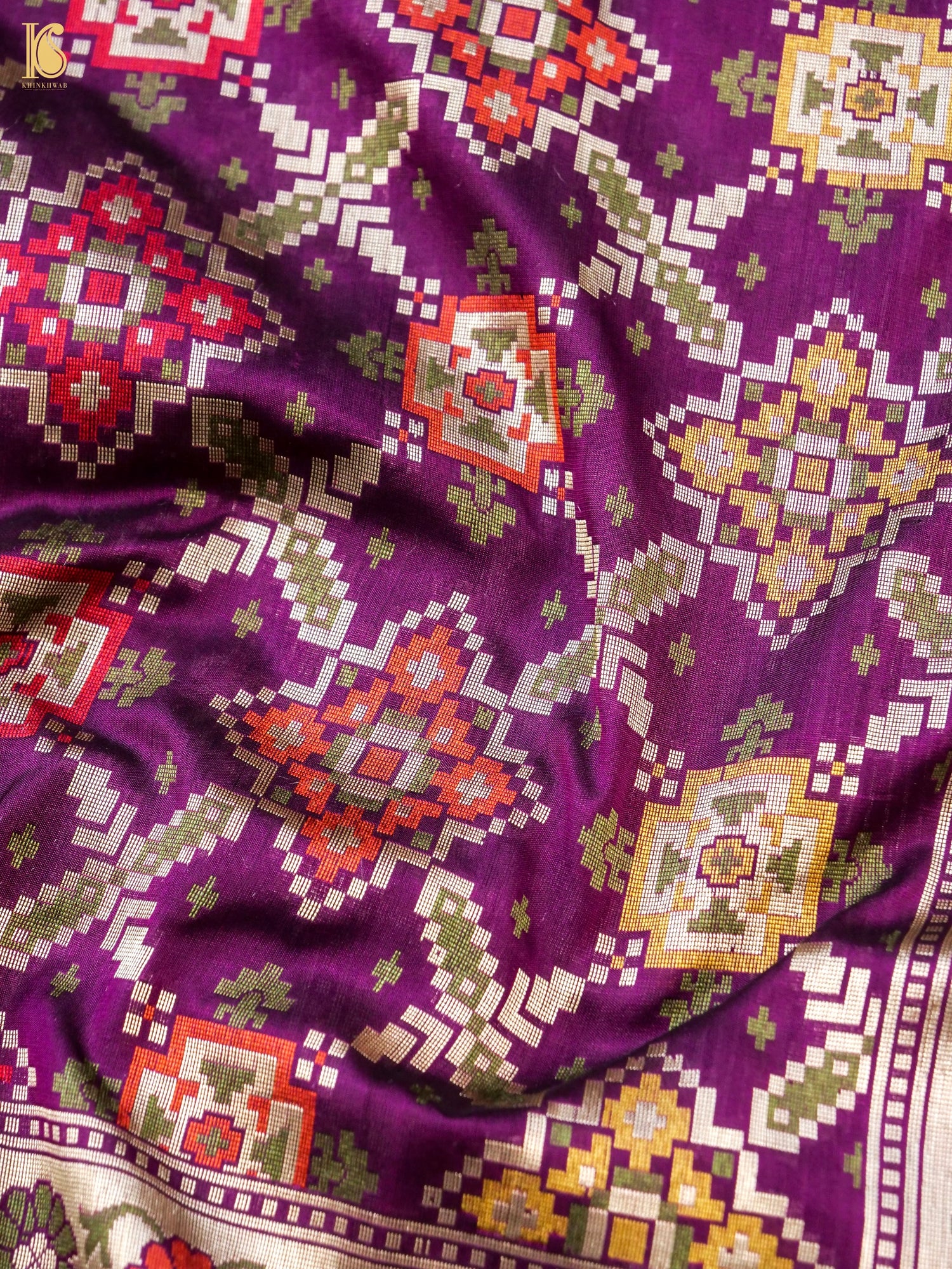 Introducing Khinkhwab's enchanting Katan Silk collection, designed to captivate your heart. Explore the allure of our meticulously crafted handloom sarees, featuring an exclusive gharchola  design pattern from patola collection.