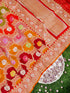 Rangkat is a traditional handloom weaving technique that involves making many changes in the warp and the weft while weaving thus producing a multicolored exquisite saree. It involves intensive labor and time to craft this stunning piece.