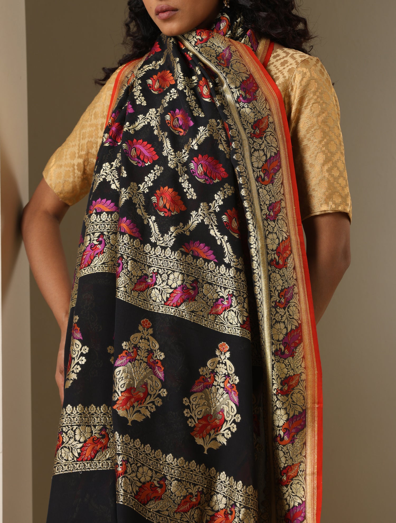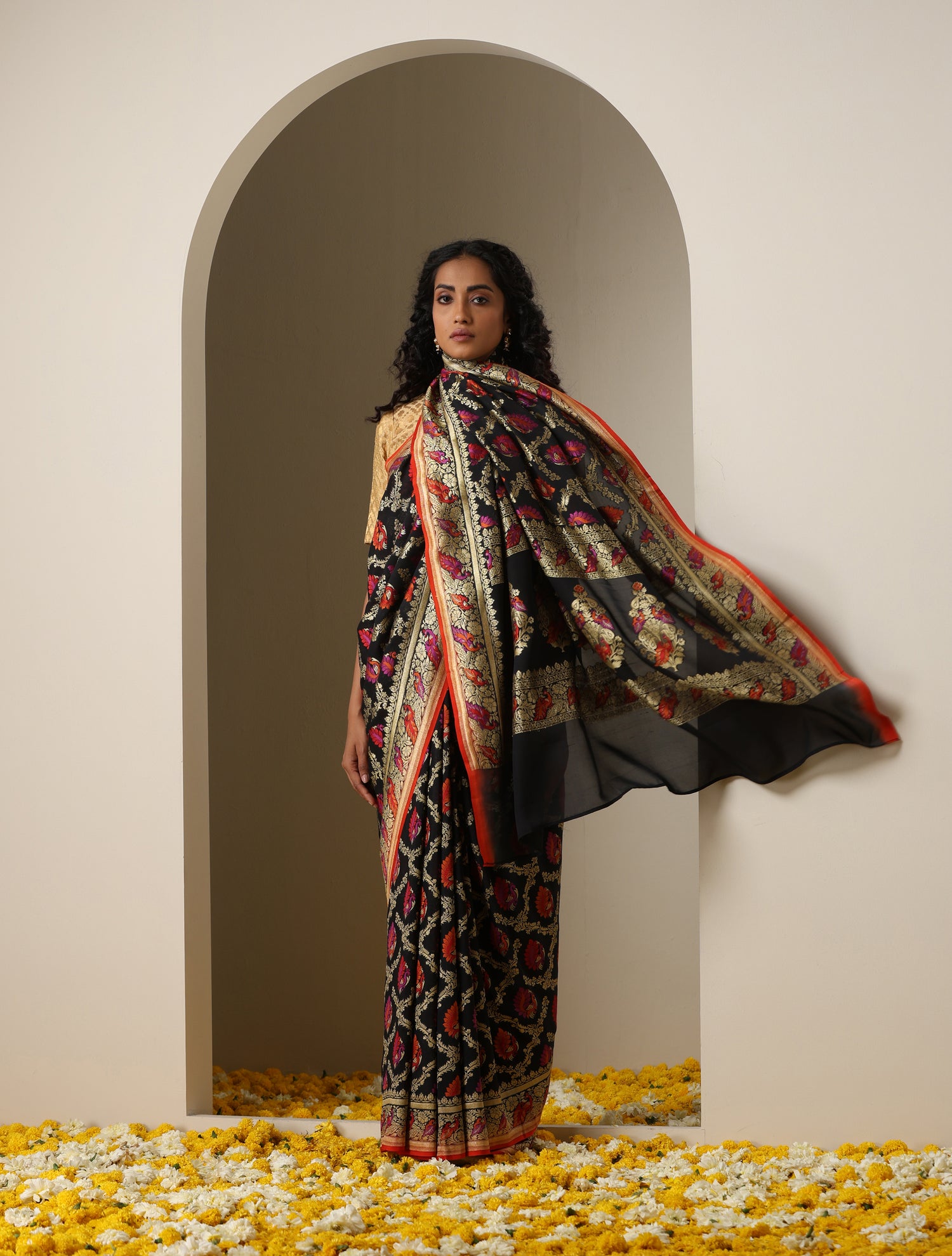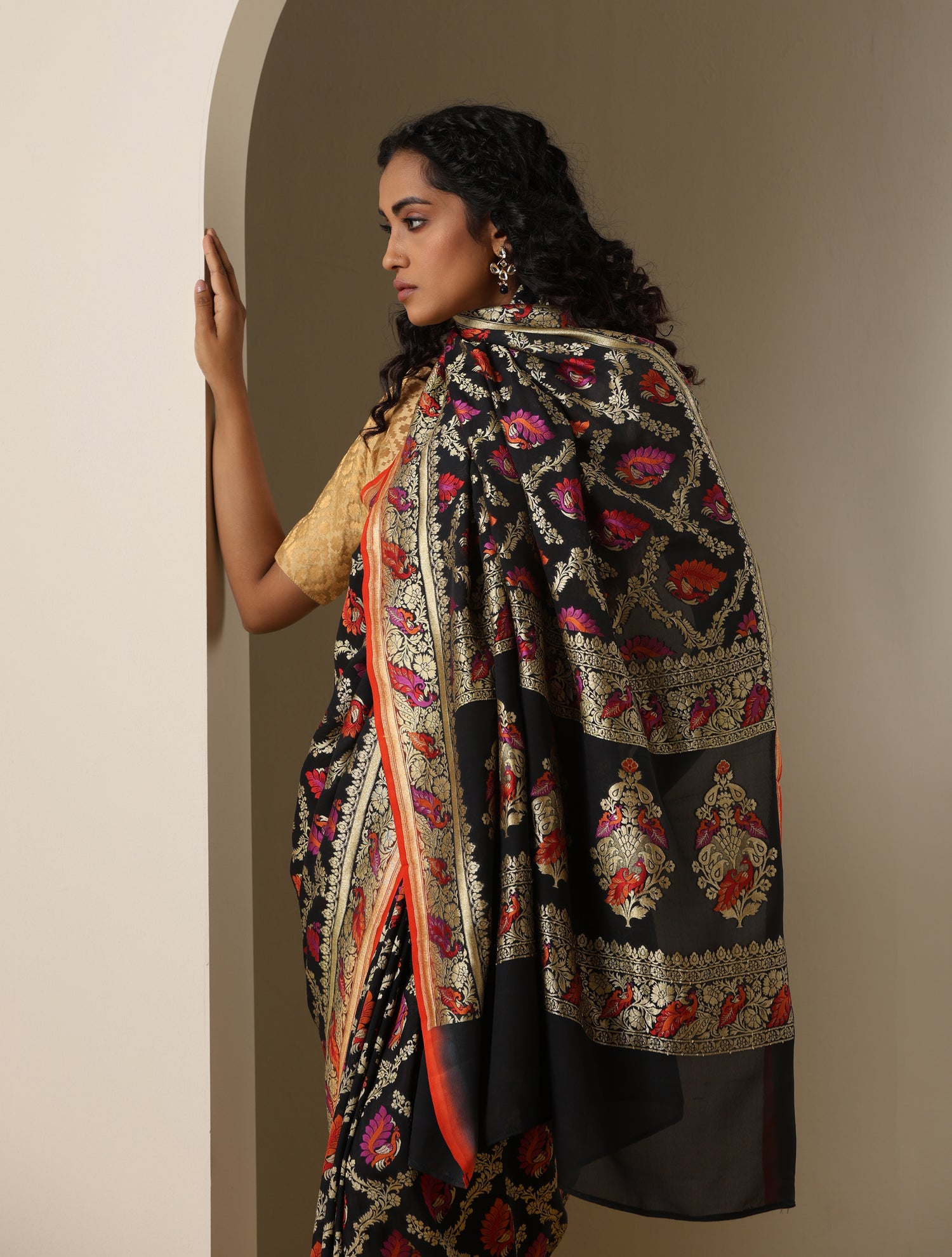 Black Pure Georgette Banarasi Peacock Meena Saree - Khinkhwab