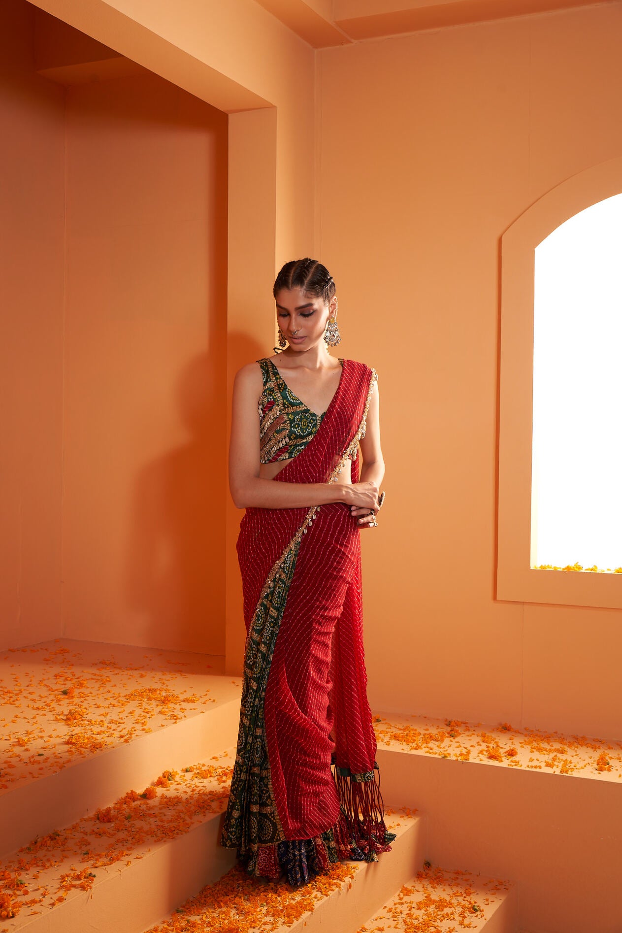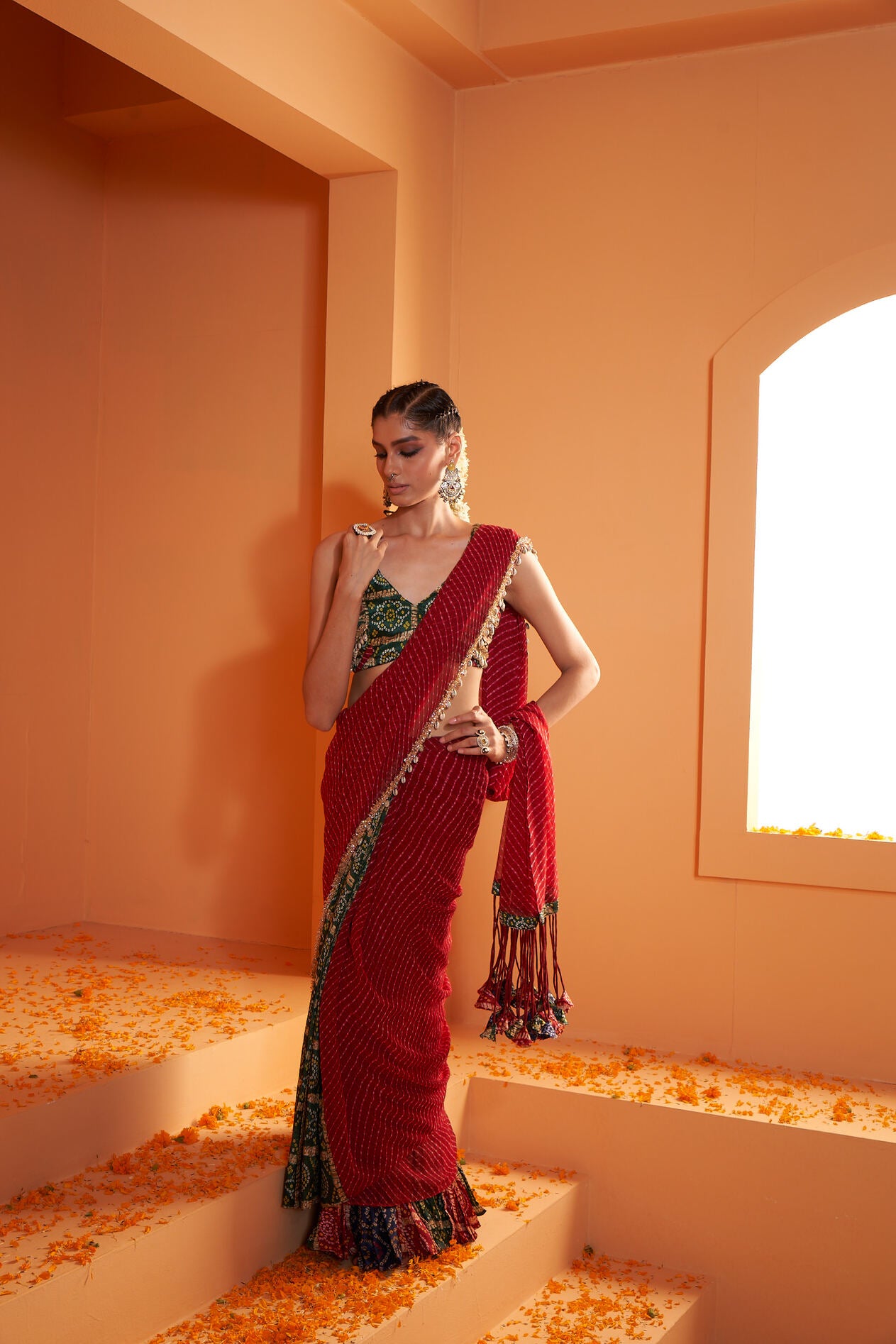 Introducing our striking Red Lehriya Drape Saree with Artsilk Bandhani and Shell detailing, accompanied by a Green Print Bandhani Blouse adorned with Shells and Fringes – a captivating ensemble that seamlessly merges traditional aesthetics with contemporary charm.