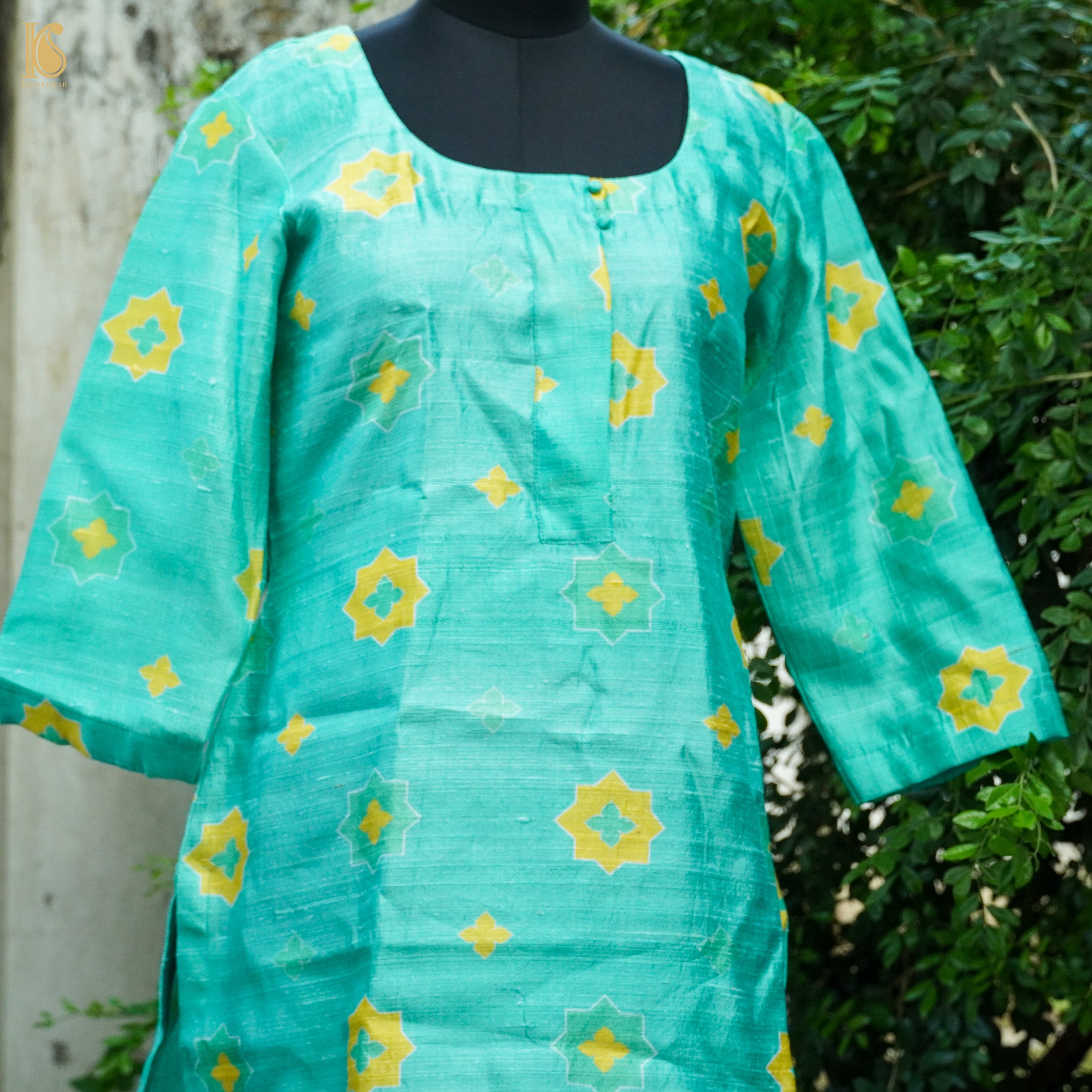 SITARA - Turquoise Pure Raw Silk Print Fabric - Khinkhwab
