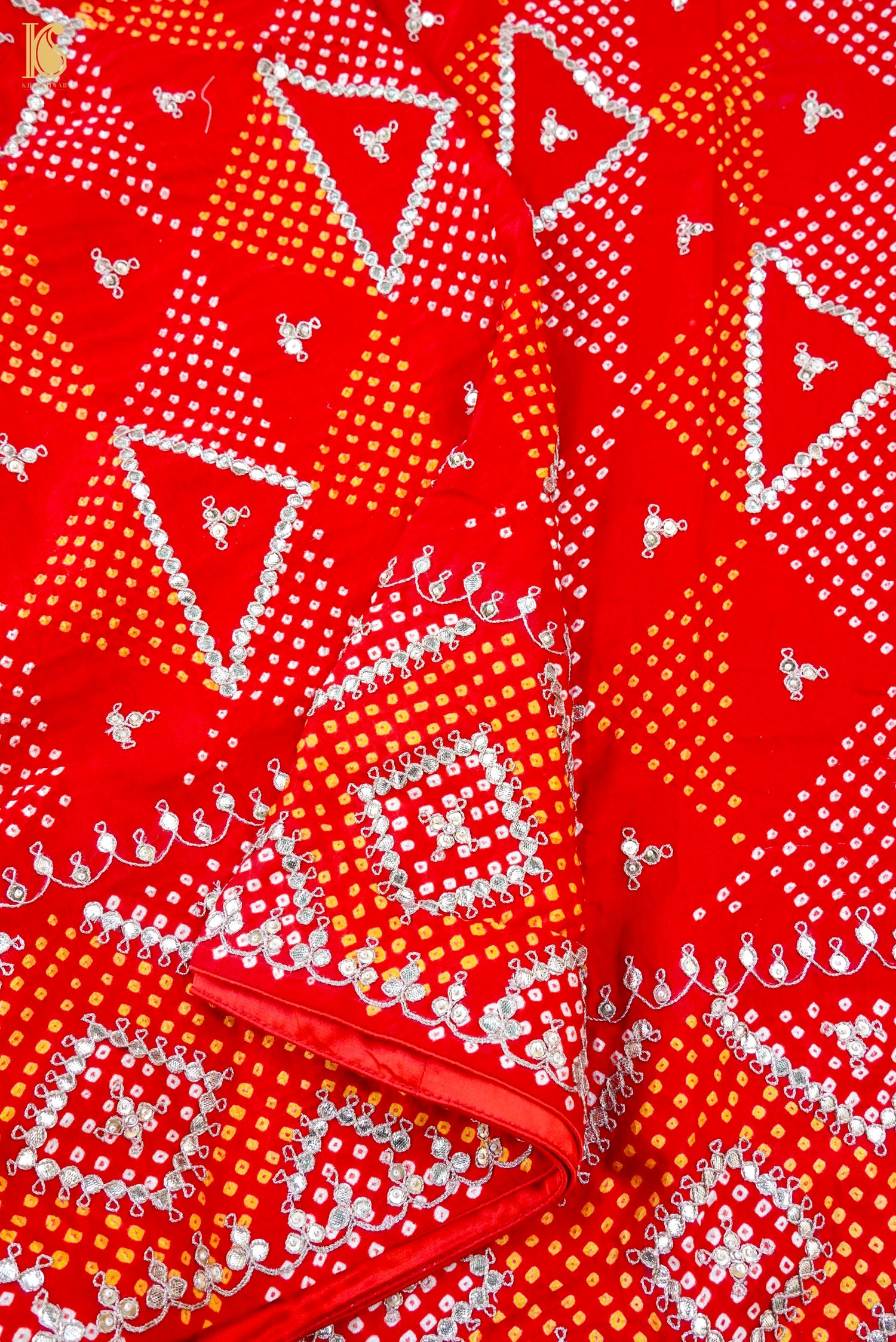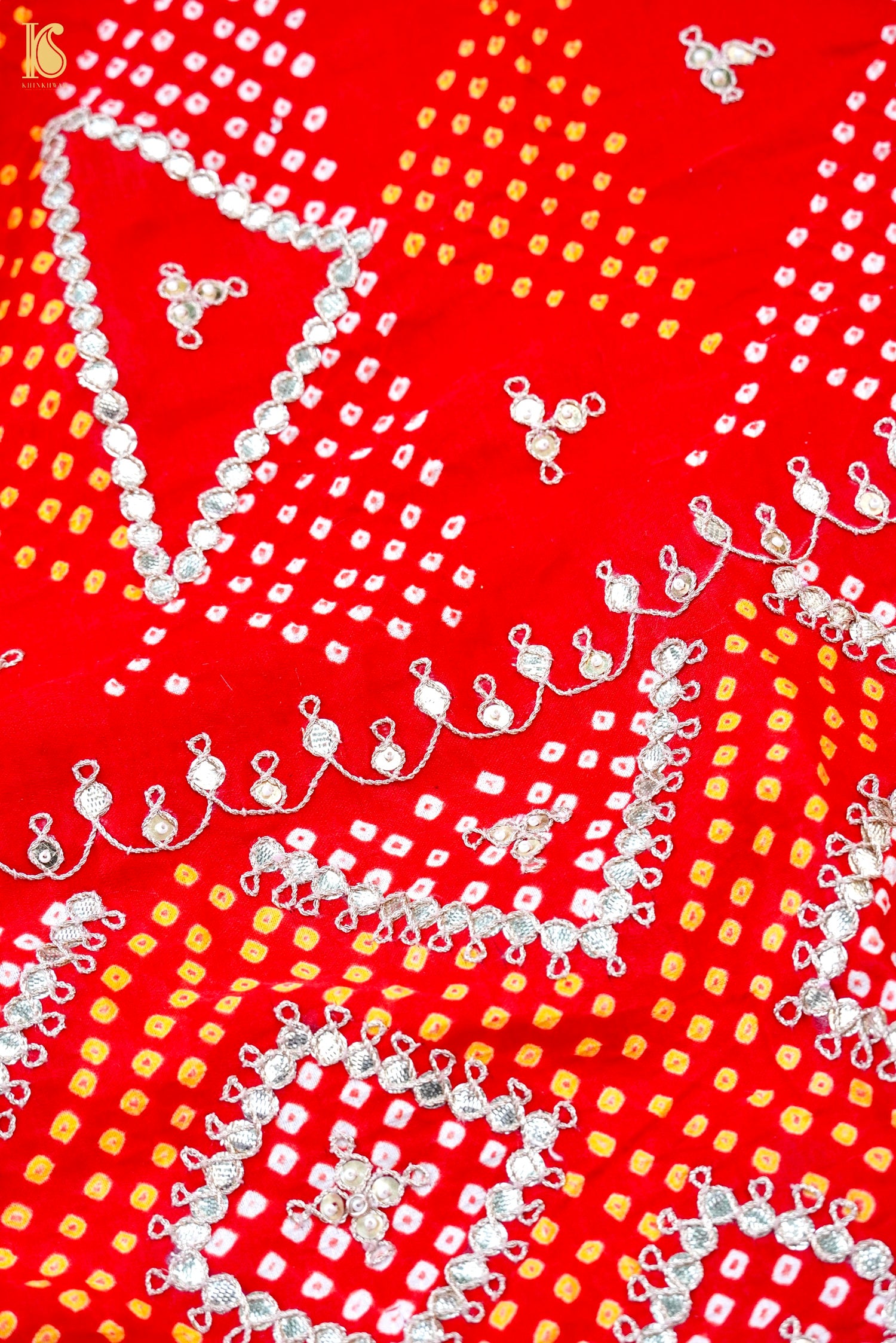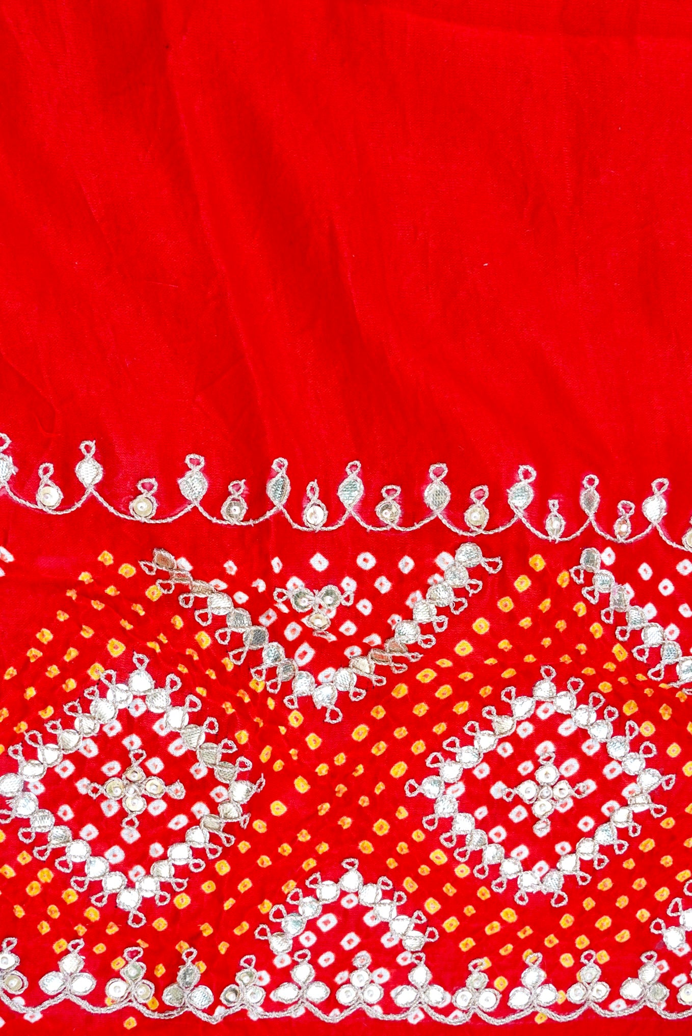This Bandhani saree with Gotta Patti embroidery is a timeless masterpiece, blending traditional artistry with contemporary elegance. Crafted from pure Gajji silk in a striking red hue, it exudes grace and sophistication.