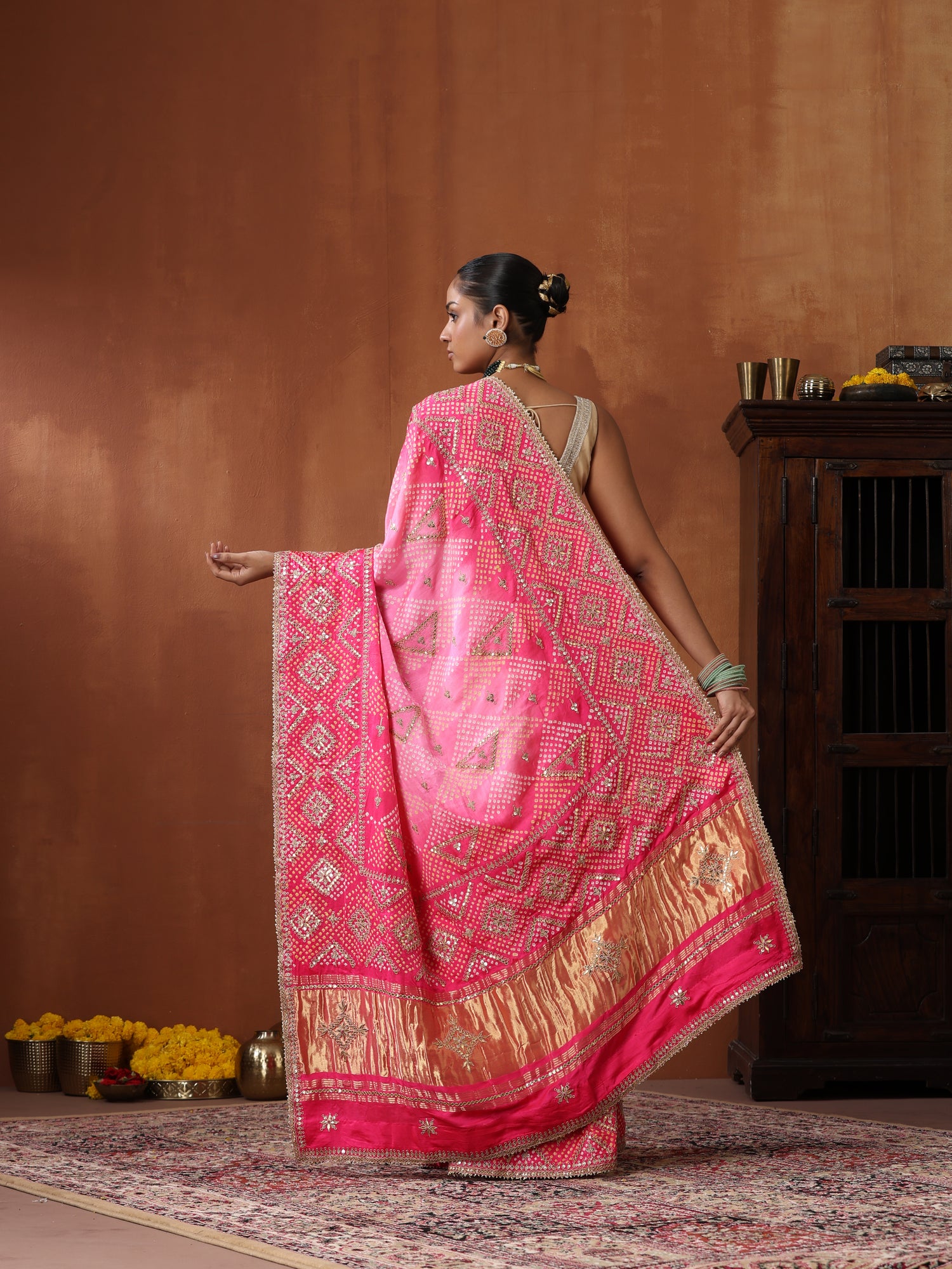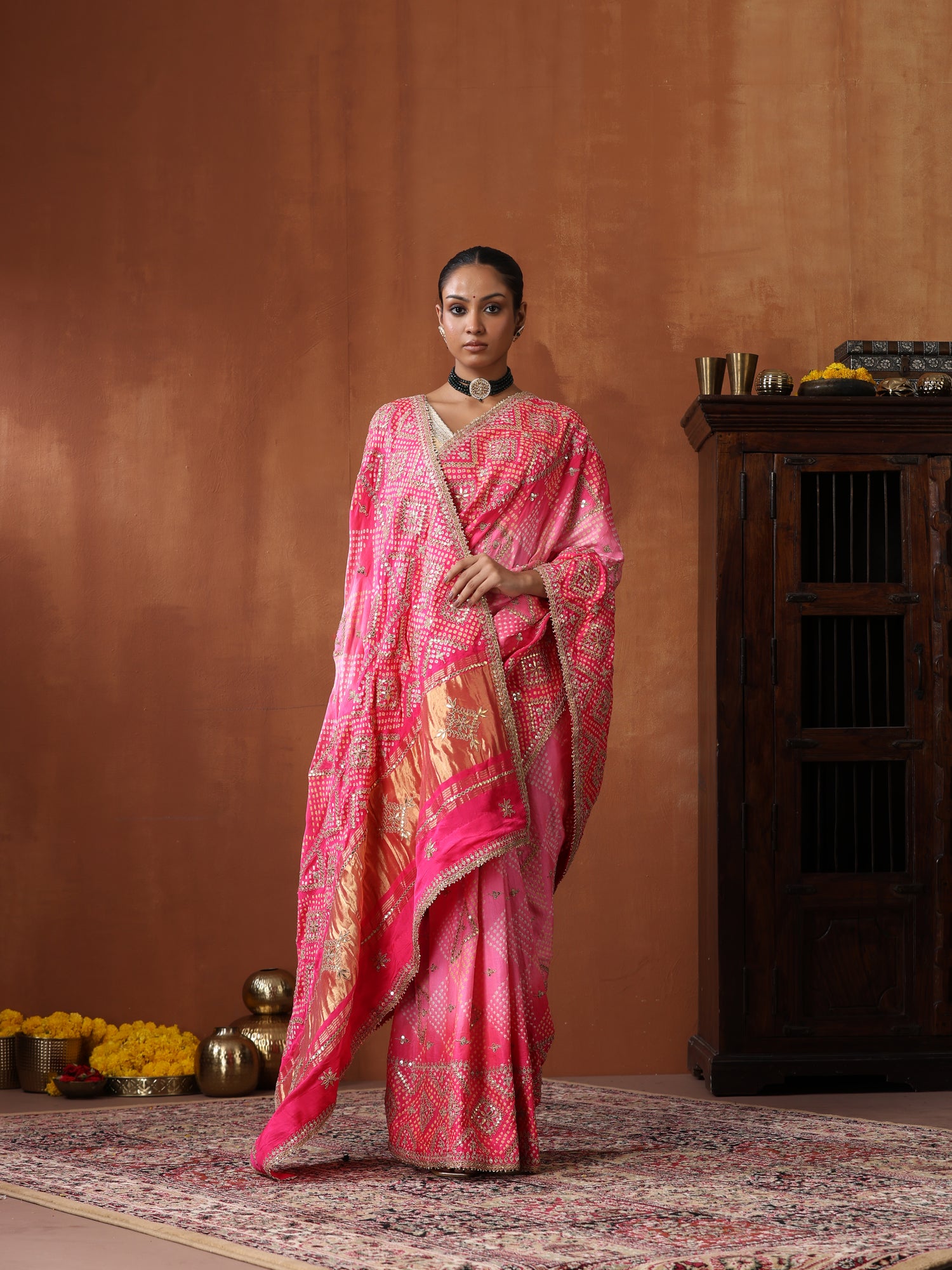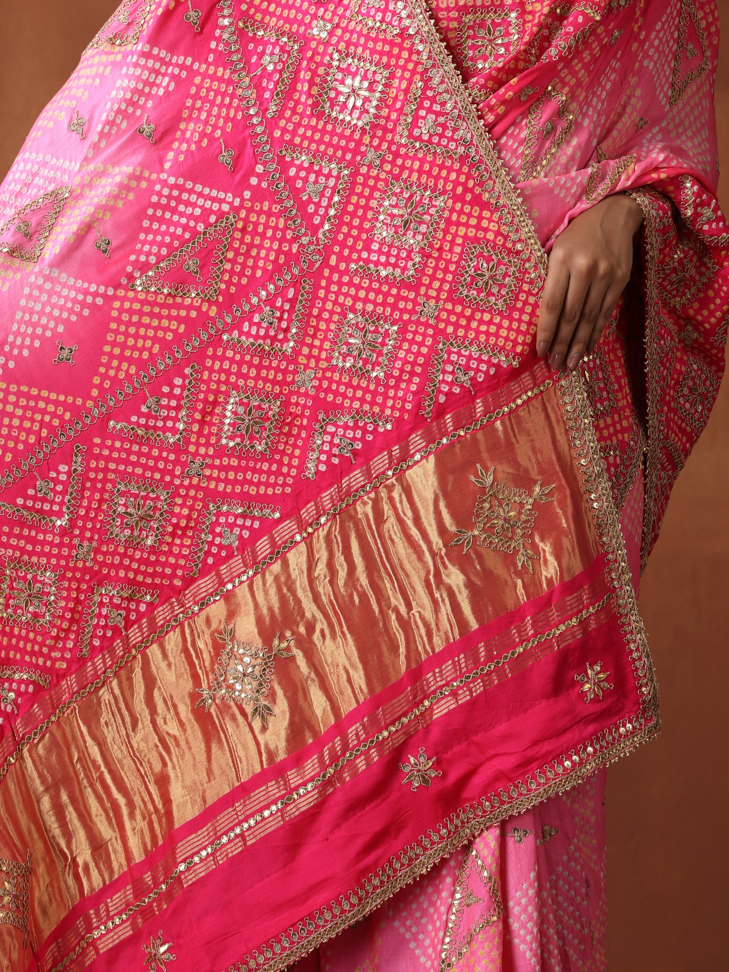 This Bandhani saree with Gotta Patti embroidery is a timeless masterpiece, blending traditional artistry with contemporary elegance. Crafted from pure Gajji silk in a striking red hue, it exudes grace and sophistication.