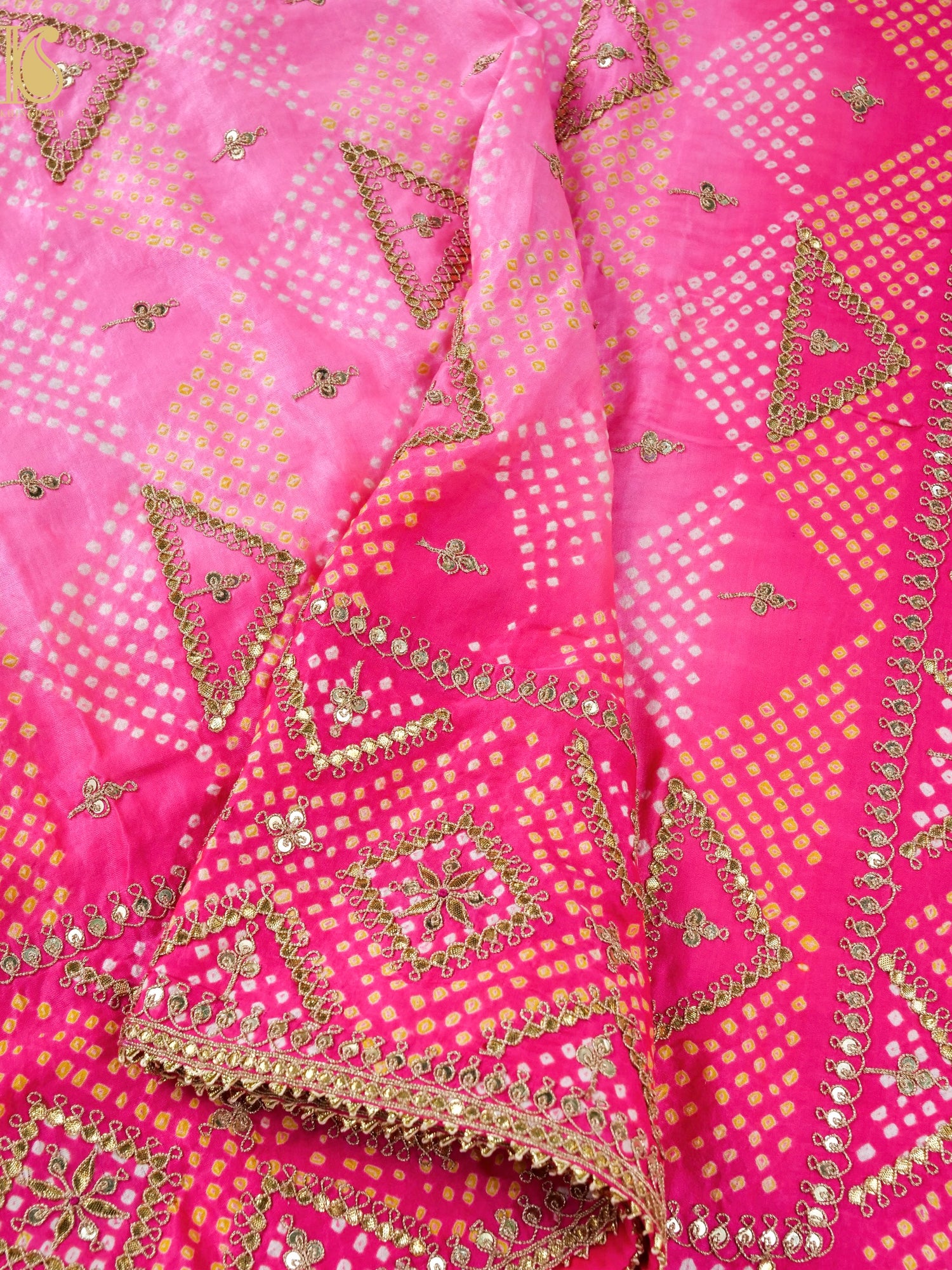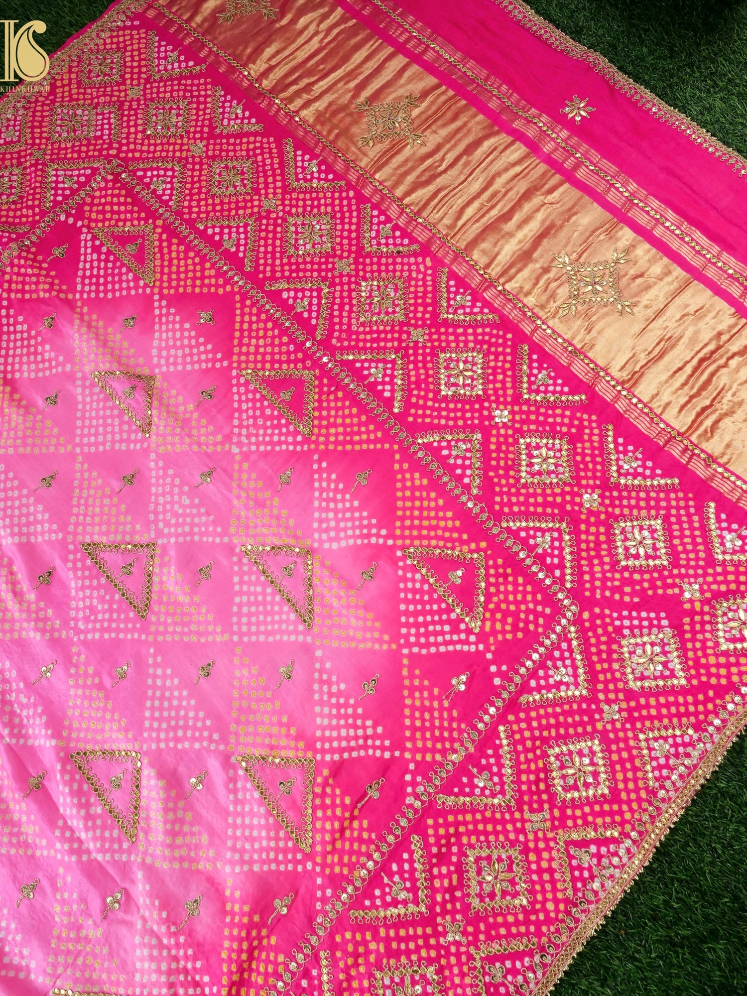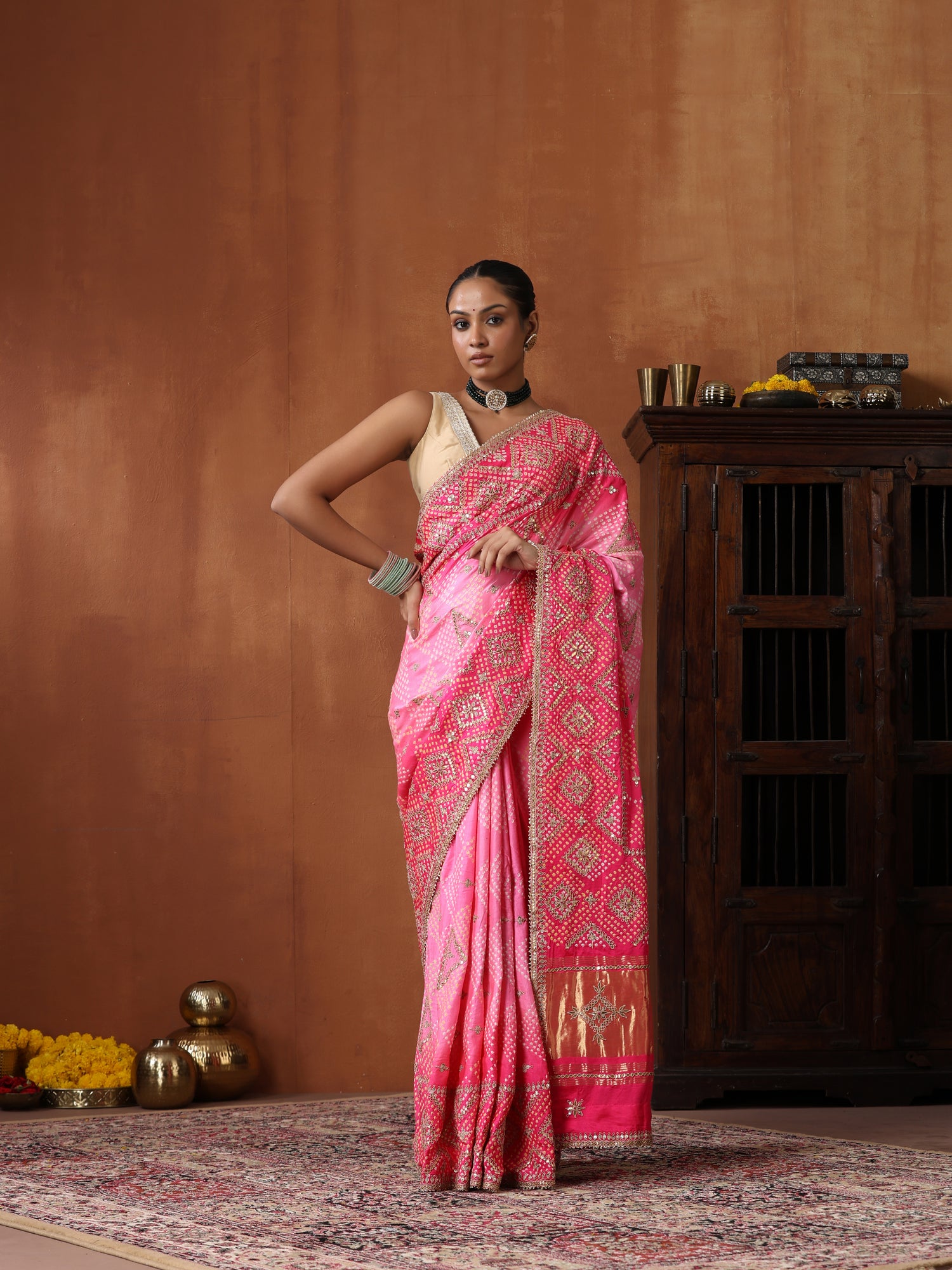 This Bandhani saree with Gotta Patti embroidery is a timeless masterpiece, blending traditional artistry with contemporary elegance. Crafted from pure Gajji silk in a striking red hue, it exudes grace and sophistication.