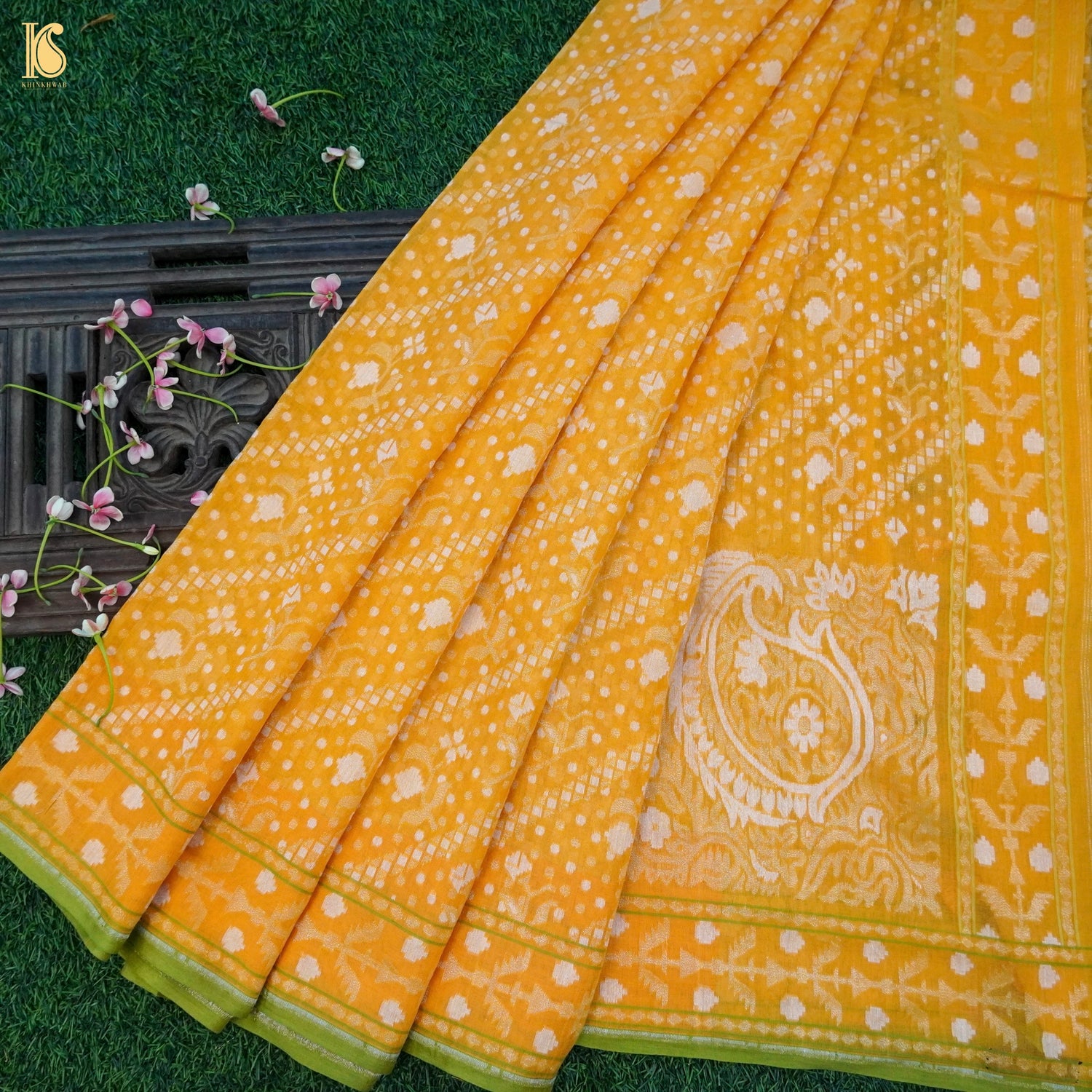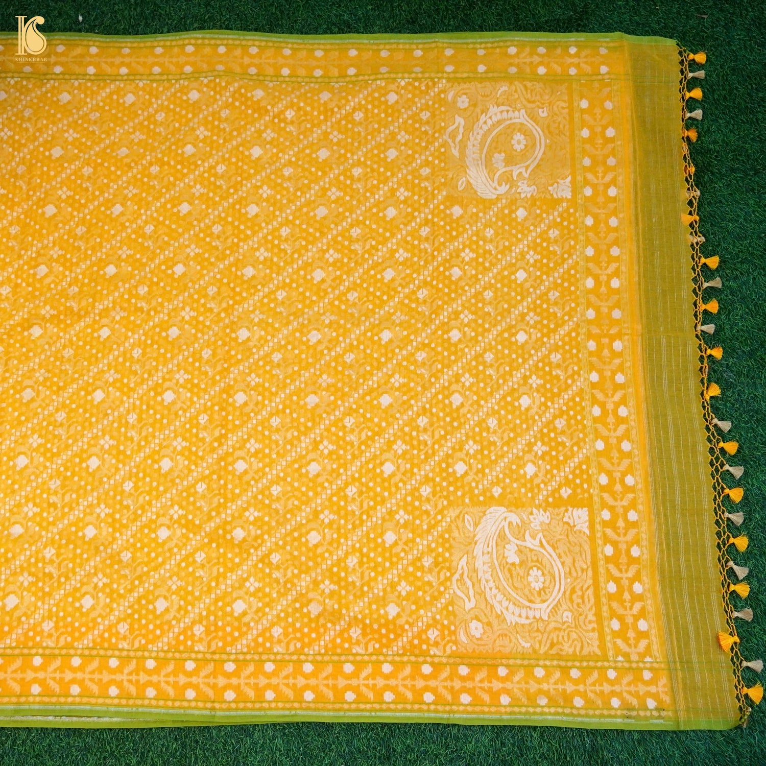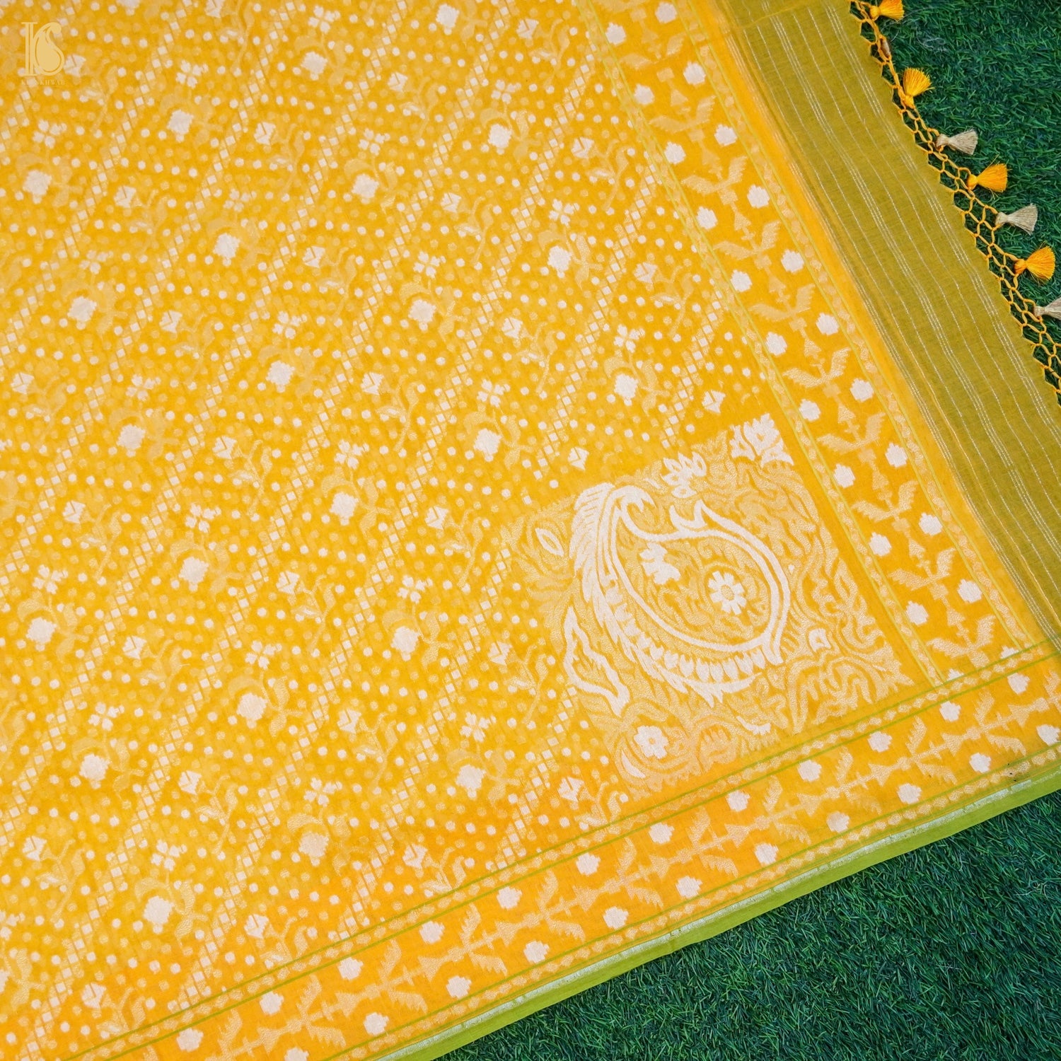 Yellow Pure Cotton Handloom Banarasi Jamdani Ektara Saree - Khinkhwab