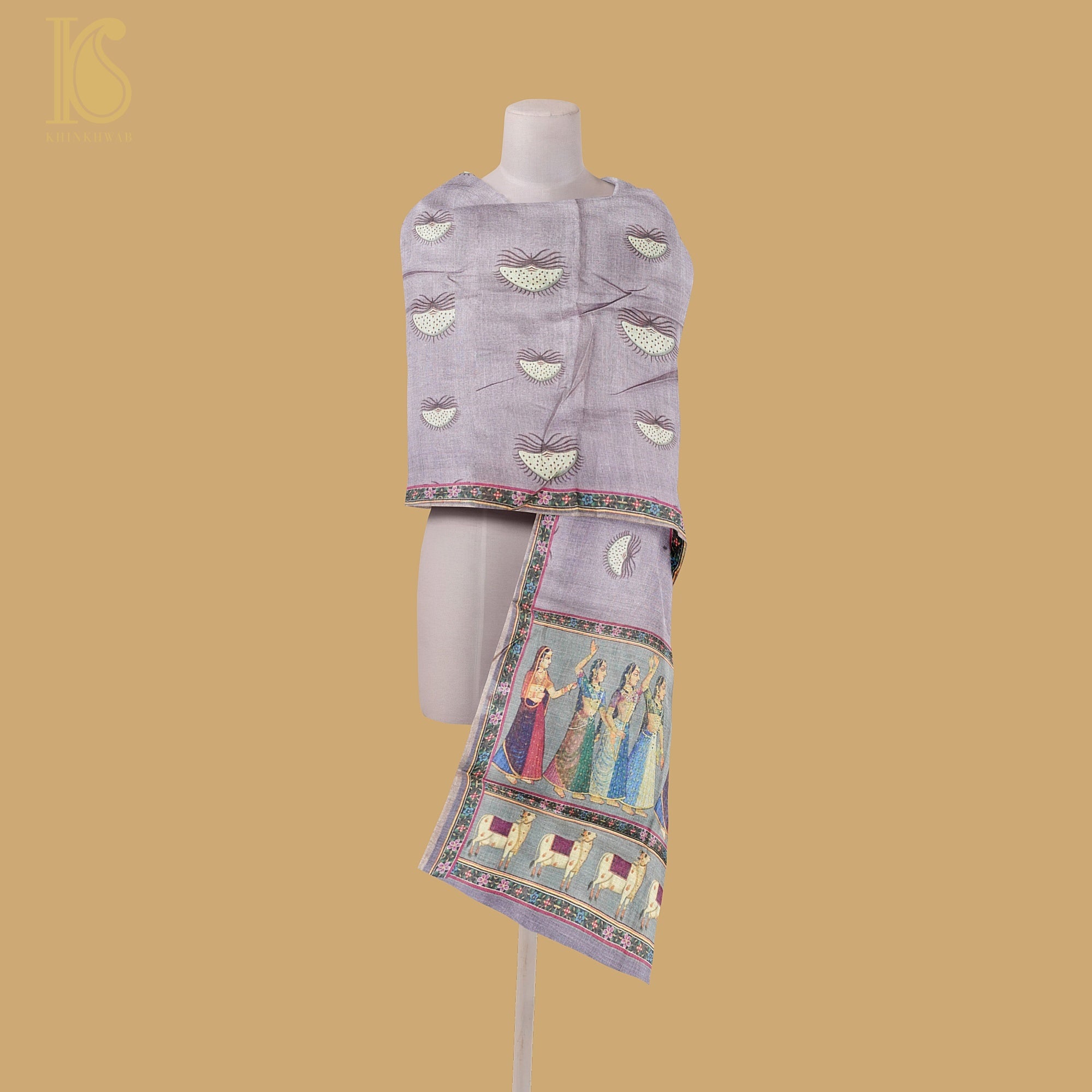 Pure Tussar Silk Lady & Cow Print Dupatta - Khinkhwab