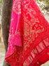 A timeless expression of artistry, this Bandhani dupatta with Gota Patti work features intricate tie-dye patterns enhanced by delicate metallic embroidery. The vibrant hues and shimmering details add a regal charm, making it a perfect statement piece for festive and celebratory occasions.