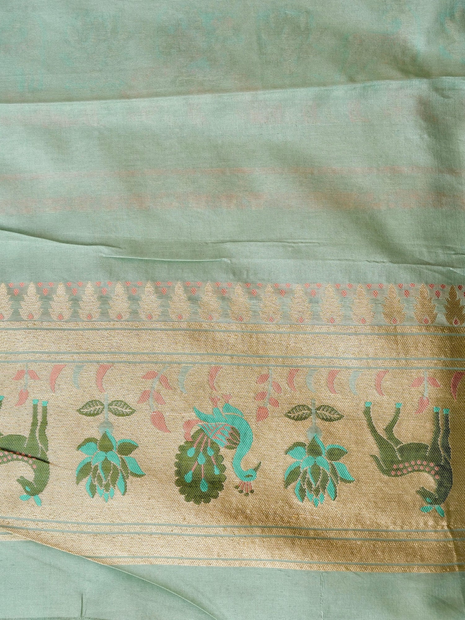 The Kinkhab saree is crafted using an elaborate and luxurious weaving technique that originated in Varanasi. This technique involves densely weaving gold and silver zari threads on a pure silk base, creating opulent patterns and motifs. The intricate designs, often inspired by nature, Mughal art, or royal themes, give the saree a tapestry-like appearance. The heavy use of zari threads in the Kinkhab weaving ensures a rich, embossed texture, making it a symbol of grandeur and heritage in Banarasi textiles.